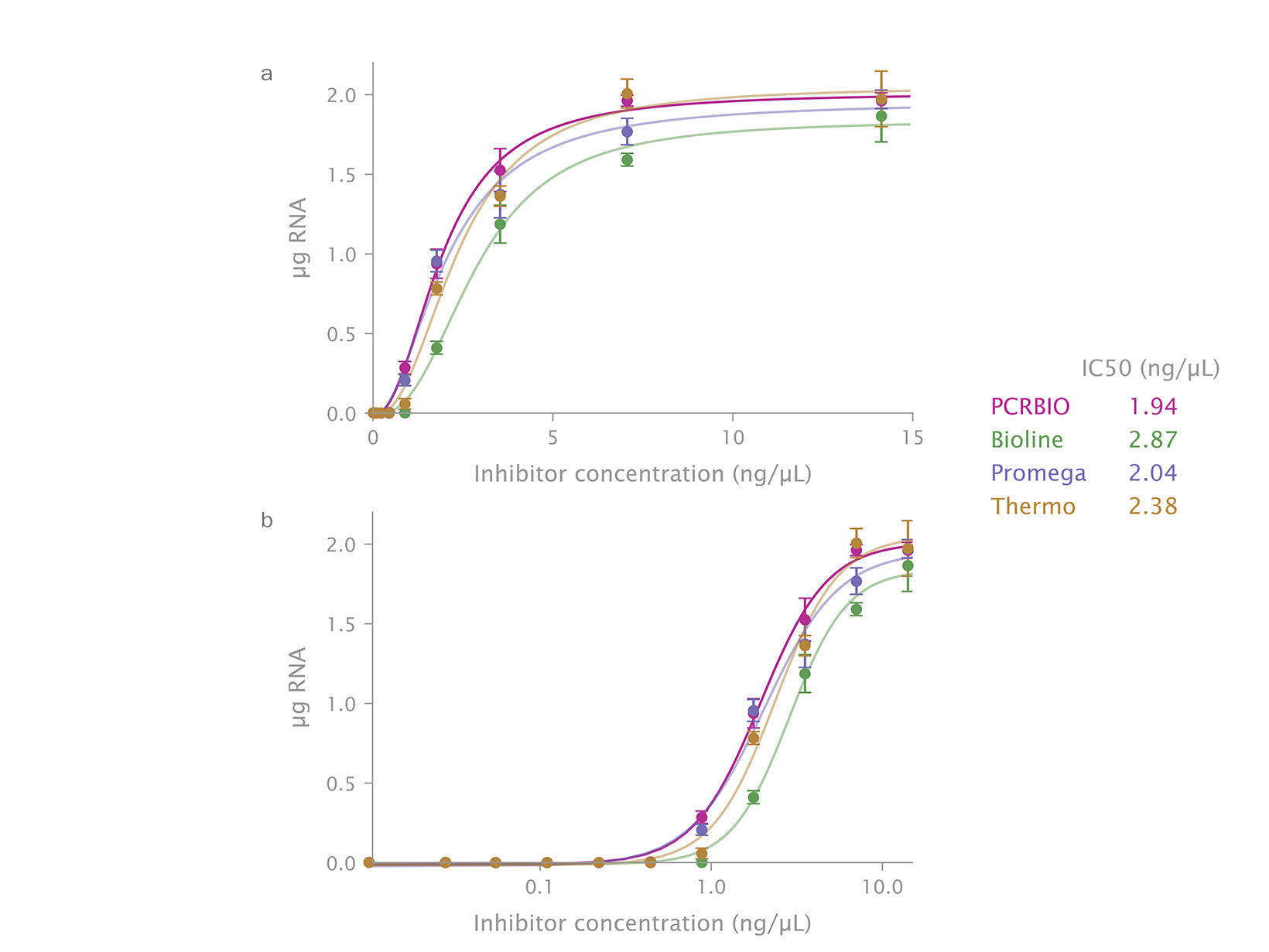 Tất cả các sản phẩm PCRBIO cho RT-PCR 1 bước và 2 bước cũng như cho tổng hợp cDNA đã chứa chất ức chế RNase, vì vậy không cần thêm chất ức chế RNase RiboShield® khi sử dụng những sản phẩm này.