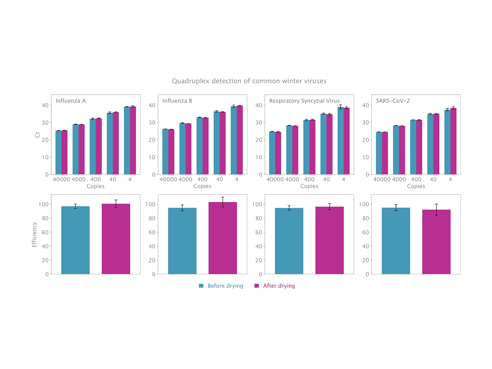 Hỗn hợp khô hành xử tương tự như hỗn hợp ướt, không có sự giảm đáng kể về độ phát quang hoặc độ trễ trong khuếch đại. Nó cũng cho thấy cùng độ nhạy và hiệu quả như tất cả các hỗn hợp Probe 1-Step của chúng tôi, phát hiện tới 4 bản sao của bộ gen virus.