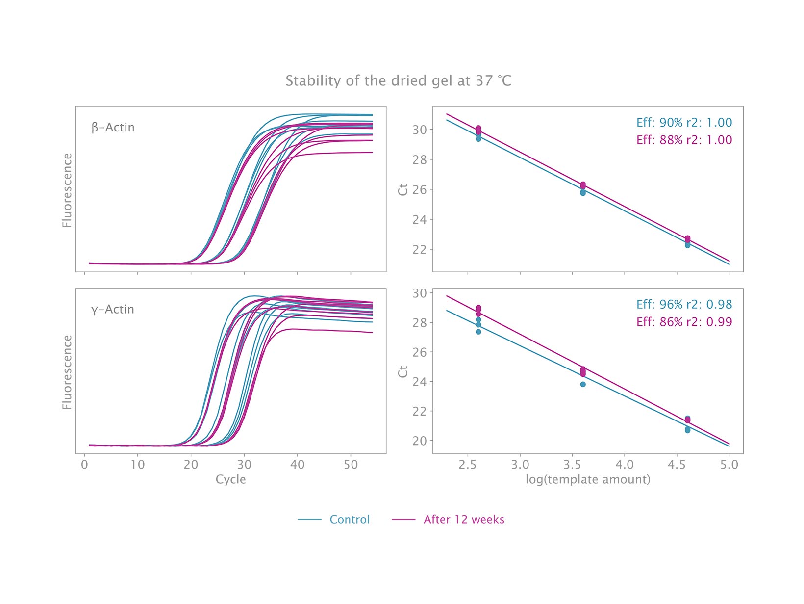 Chúng tôi không quan sát thấy sự mất hoạt tính đáng kể (tức là, không giảm độ phát quang và trễ dưới 1 Ct trong khuếch đại) khi chúng tôi ủ gel khô ở 37 °C trong 3 tháng.