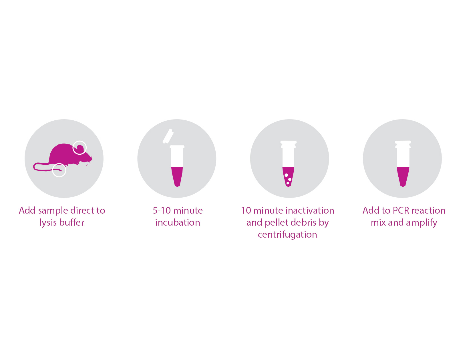 Loại bỏ nhu cầu sử dụng các phương pháp chiết xuất DNA tốn công sức và thời gian với bộ kit nhanh chóng và đơn giản này, đã được tối ưu hóa cho nhiều loại mẫu khác nhau. Bộ kit đặc biệt phù hợp với mô rắn như đuôi chuột hoặc tai chuột, và cũng có thể được sử dụng với mô mềm, nang lông, mẫu tăm miệng, máu động vật có vú và mô FFPE.