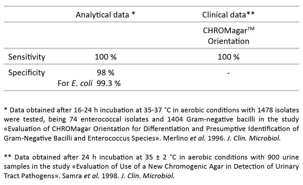Việc nuôi cấy đồng thời là cần thiết để thu hồi các vi sinh vật cho các thử nghiệm vi sinh học hoặc phân loại dịch tễ học thêm. Sự thiếu tăng trưởng hay sự vắng mặt của khuẩn lạc trên CHROMagar™ Orientation không loại trừ sự hiện diện của vi khuẩn. CHROMagar™ Orientation không nhằm chẩn đoán nhiễm trùng hoặc hướng dẫn hay theo dõi điều trị nhiễm trùng.